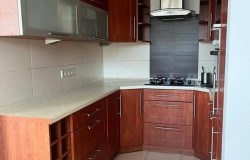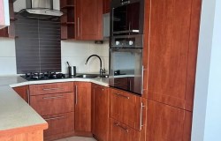 Kuchnia umeblowana, wykonana na wymiar – w cenie pozostają wszystkie sprzęty AGD: zabudowana zmywarka, piekarnik, płyta gazowa, kuchenka mikrofalowa oraz lodówka.
