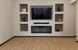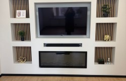 W części salonowo-jadalnianej zastosowano dekoracyjne lamele, które stanowią elegancki i modny element aranżacyjny, wykonano podwieszany sufit z nowoczesnym oświetleniem LED.